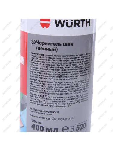 | Наименование | Чернитель шин 400мл пенный аэрозоль WURTH в Борисоглебске Воронежской области |