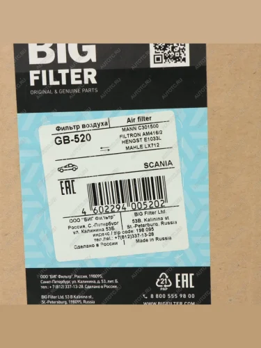 | Наименование | Фильтр воздушный SCANIA R144 (95-) дв.DSC911 912 914 (527х303х170мм) (вставка A5831) BIG FILTER BIG FILTER gb-520 в Борисоглебске Воронежской области |