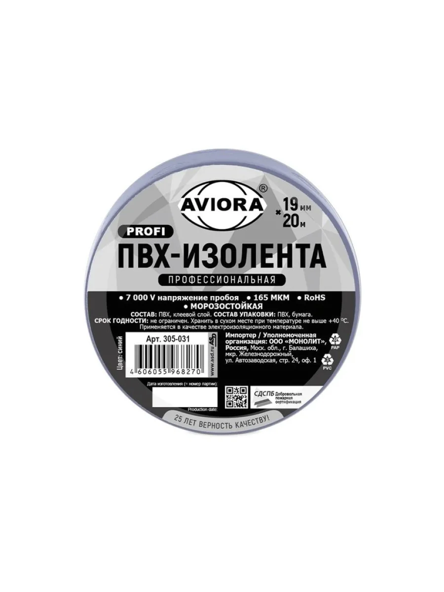 | Наименование | Изолента ПВХ синяя 19x0.165мм 20м профессиональная морозостойкая AVIORA в Борисоглебске Воронежской области |