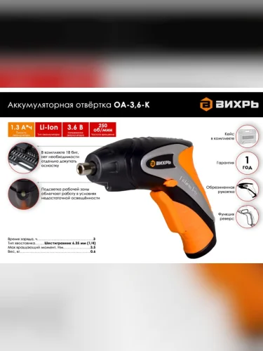 Отвертка аккумуляторная 3.6В 1.3Ач с подсветкой (набор бит кейс) ВИХРЬ ВИХРЬ оа-3 6-к в Борисоглебске Воронежской области