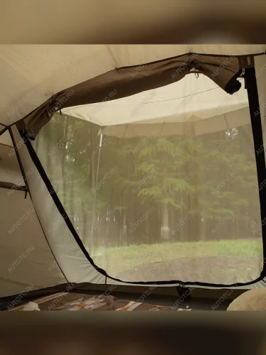 Отличный вариант для кемпинга - просторный тамбур, представляющий из себя почти полноценный шатер, где можно организовать пространство для досуга или кухню-столовую..