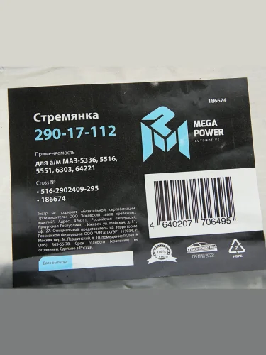 | Наименование | Стремянка МАЗ-5336 5516 5551 6303 64221 рессоры передней L=295мм;М24х2мм усиленная MEGAPOWER MEGAPOWER 290-17-112 в Борисоглебске Воронежской области |